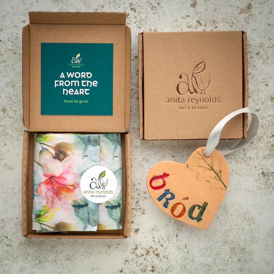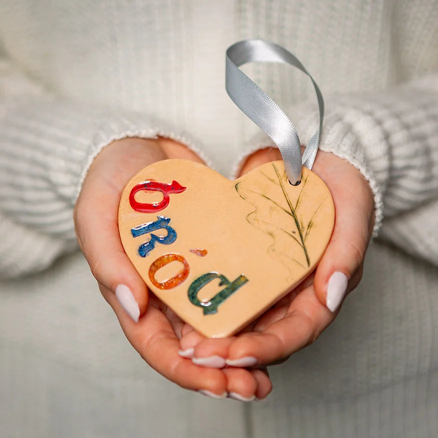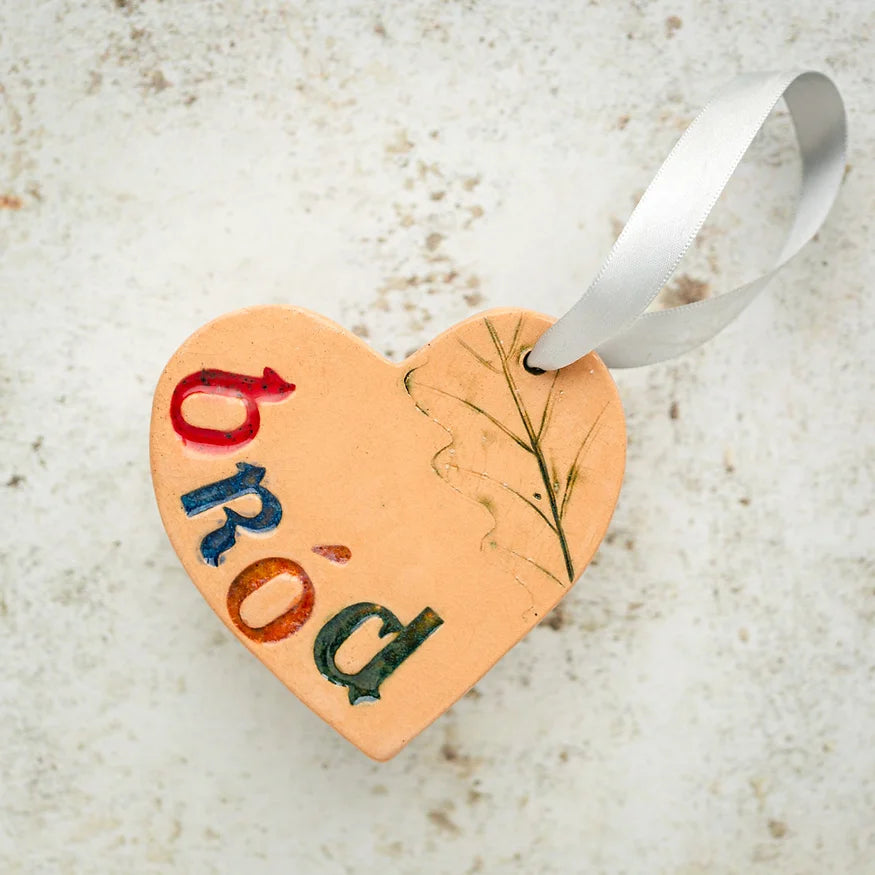 Each heart is handmade by Anita Reynolds. Vintage Irish handmade embroidery / lace or leaves from a native Irish tree was pressed into the clay to create a decorative pattern on your heart. She has stamped a little Irish word in the clay using original printer's type. This wooden Gaelic font was once used by her father and grandfather in their printing business in Co. Meath.