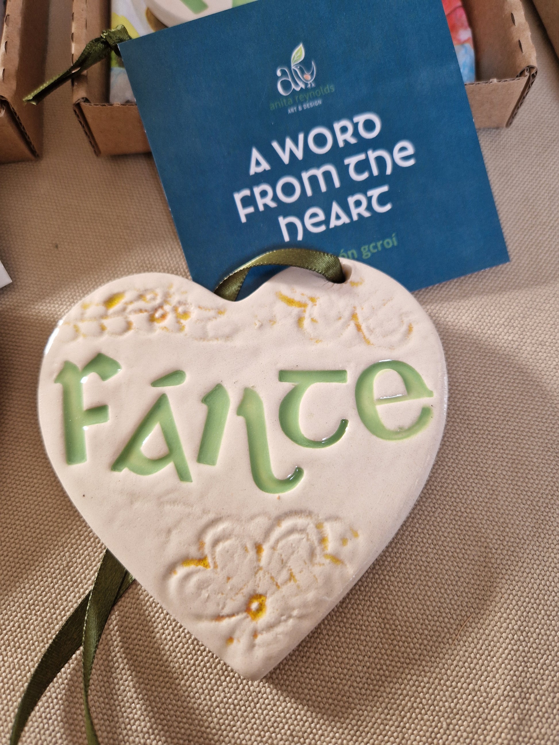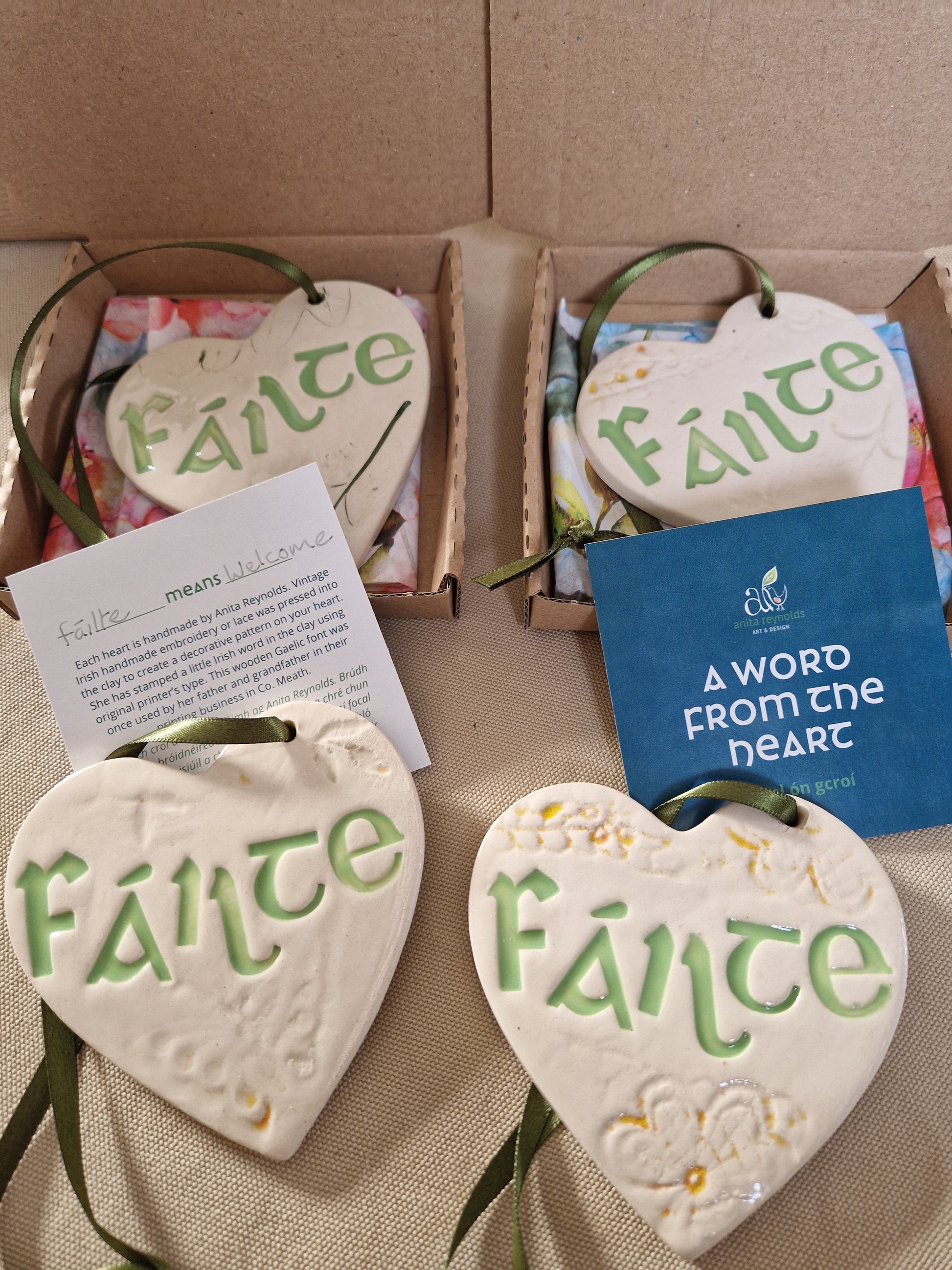 Each heart is handmade by Anita Reynolds. Vintage Irish handmade embroidery / lace or leaves from a native Irish tree was pressed into the clay to create a decorative pattern on your heart. She has stamped a little Irish word in the clay using original printer's type. This wooden Gaelic font was once used by her father and grandfather in their printing business in Co. Meath.