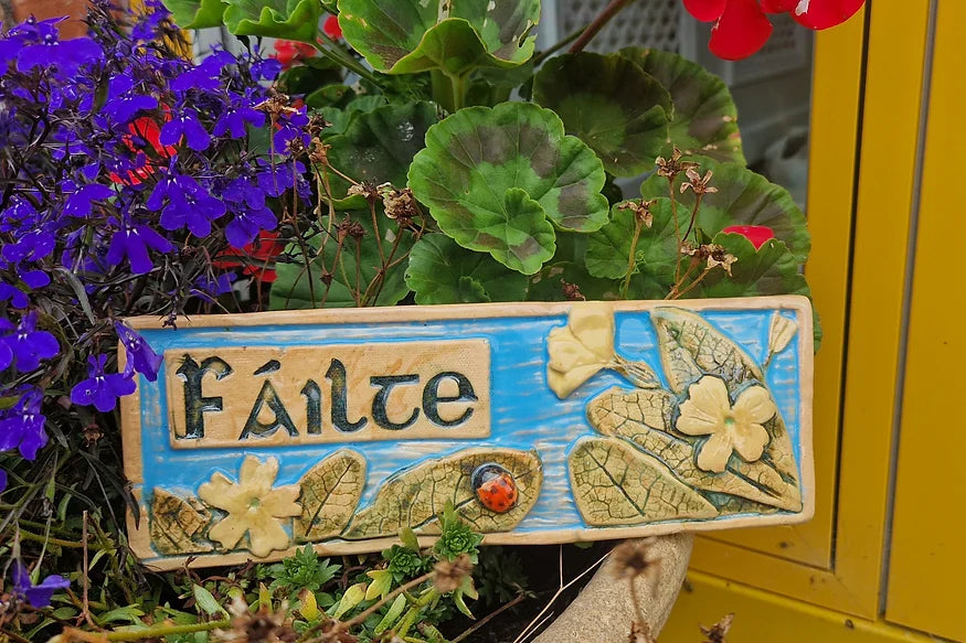 Fáilte is the Irish word for welcome. This little relief plaque shows Irish primroses which I've pressed into the clay. They are one of the earliest flowers to appear in the hedgerows in Spring. Ive also included a little ladybug to welcome you!