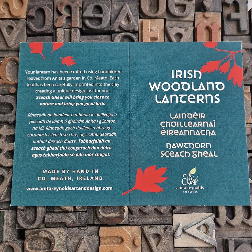 Your lantern has been crafted using handpicked leaves from Anita’s garden in Co. Meath. Each leaf has been carefully imprinted into the clay, creating a unique design just for you.