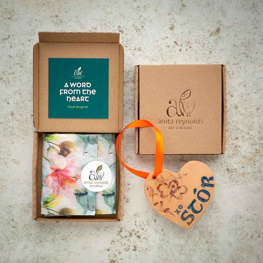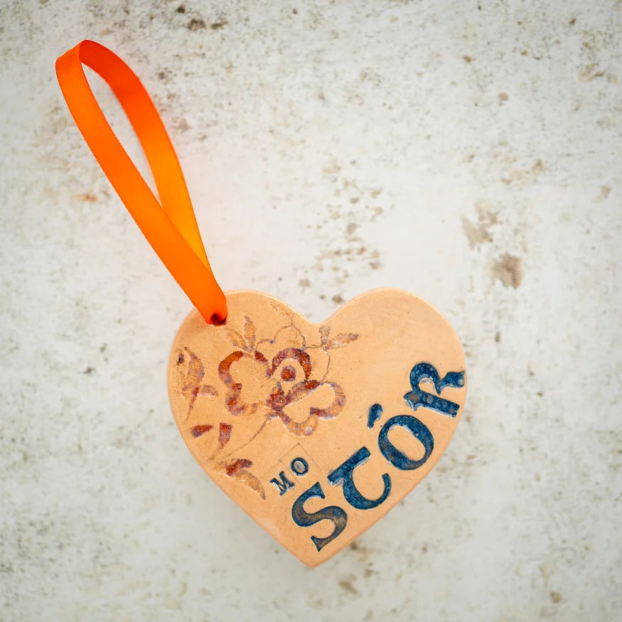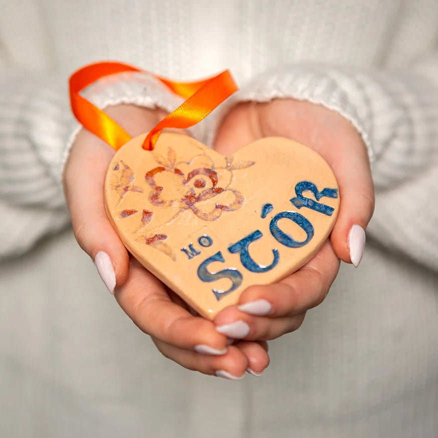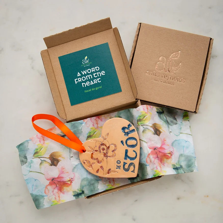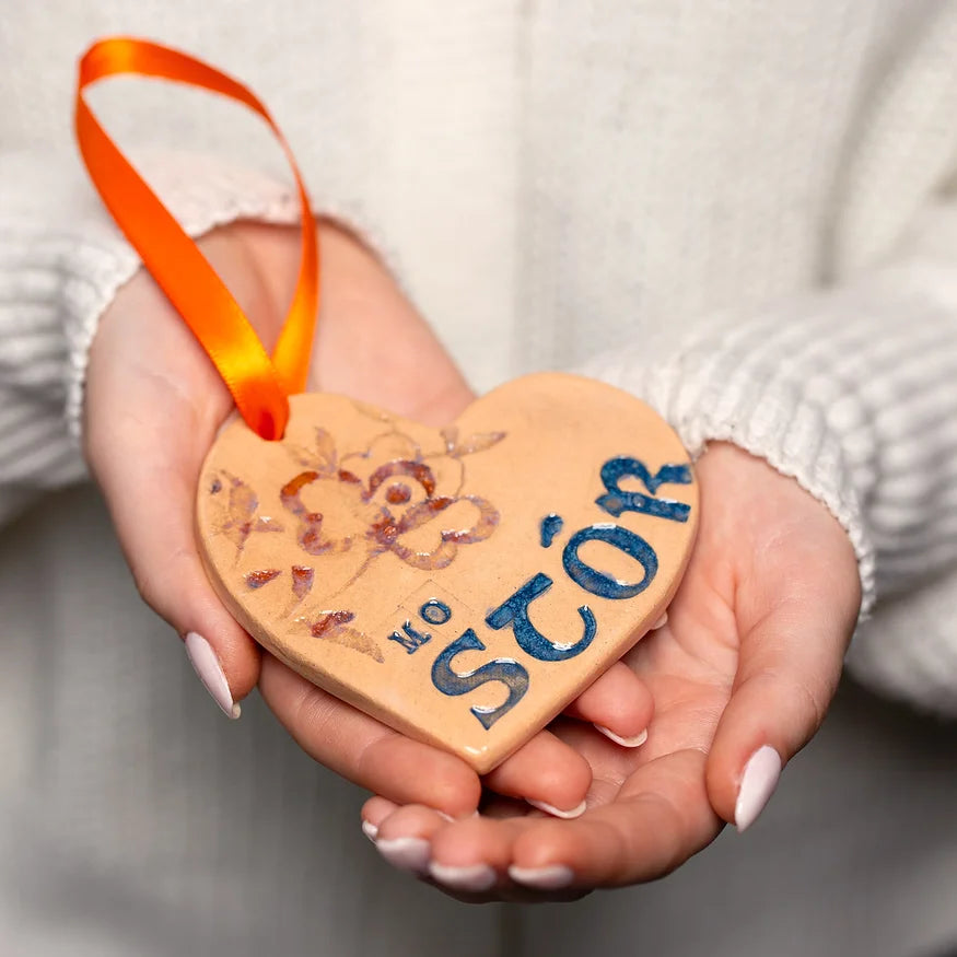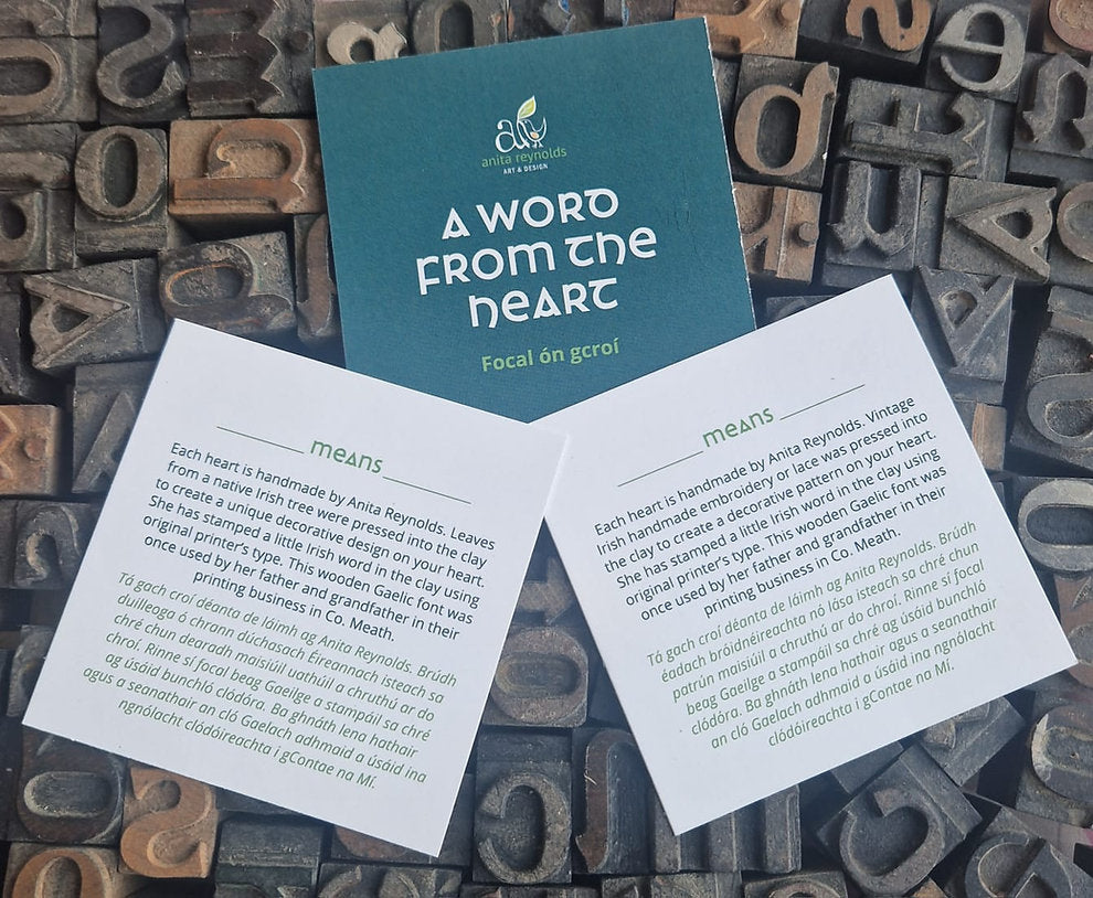 Each heart is handmade by Anita Reynolds. Vintage Irish handmade embroidery / lace or leaves from a native Irish tree was pressed into the clay to create a decorative pattern on your heart. She has stamped a little Irish word in the clay using original printer's type. This wooden Gaelic font was once used by her father and grandfather in their printing business in Co. Meath.