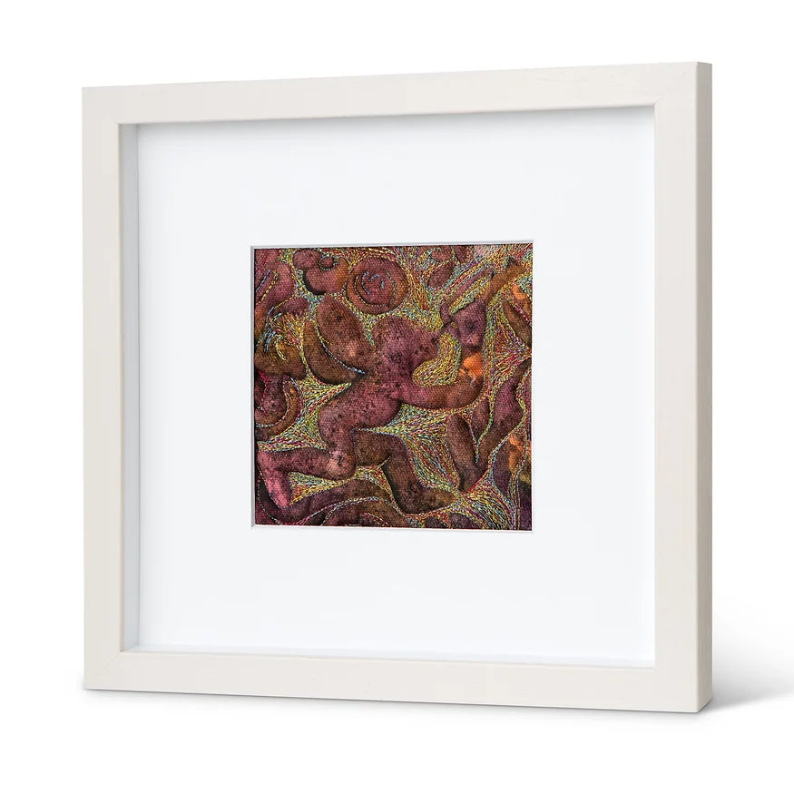This cute little Cupid adorns the medieval tomb of the Cruise family in Cruicetown Co.Meath. A beautiful effigial tomb carved in stone and raised in high relief Anita has taken this joyful section of the historical design and created it on cotton.