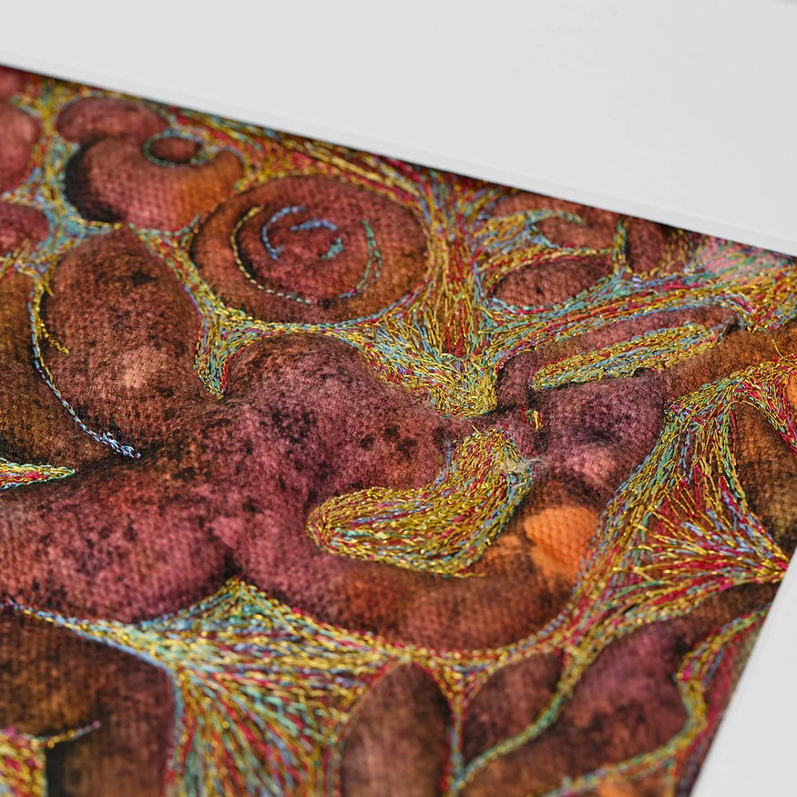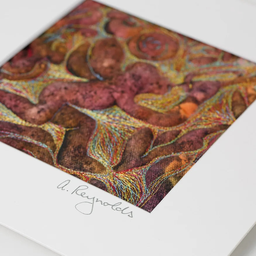 Each piece is hand dyed, quilted and finished with free machine embroidered in an array of vibrant coloured and metallic threads. Anita has always loved these beautiful carvings which are situated close to her childhood home in Irelands Ancient East.