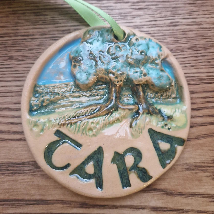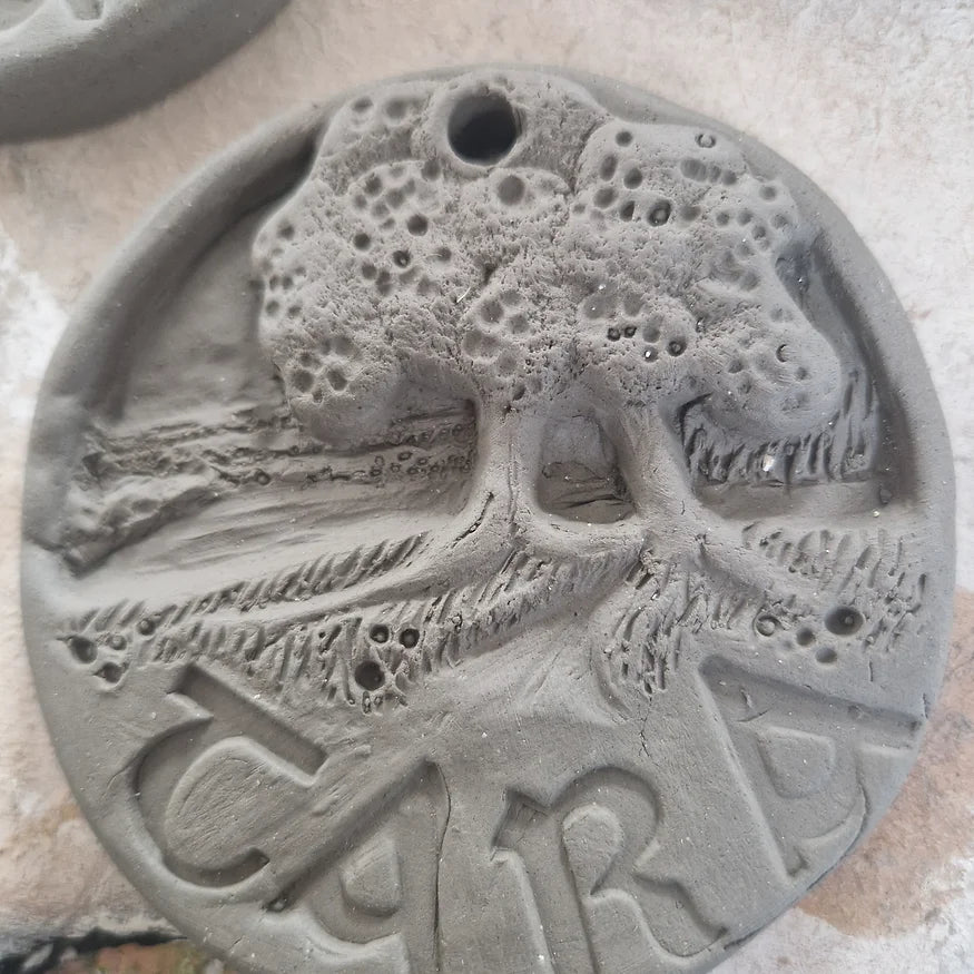 Lettering is stamped onto the clay using my Dad's wooden printers type. This beautiful Irish font includes a fada or mark above a vowel.
