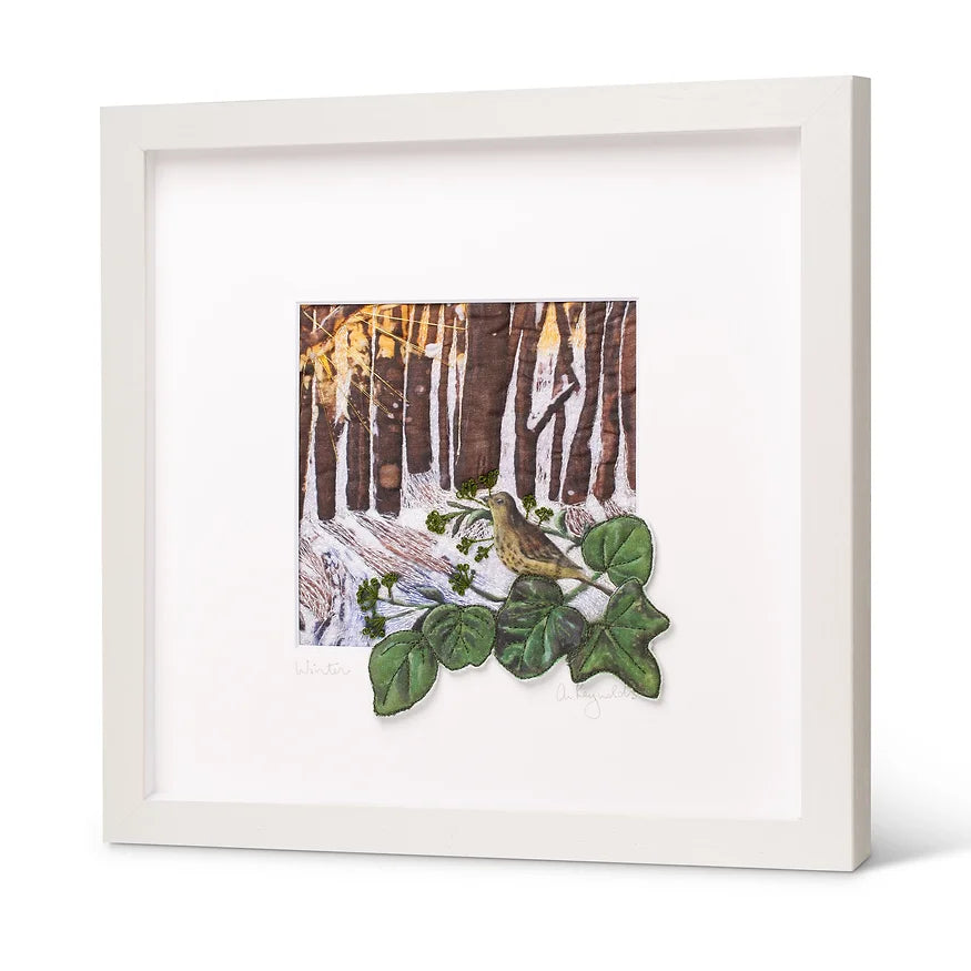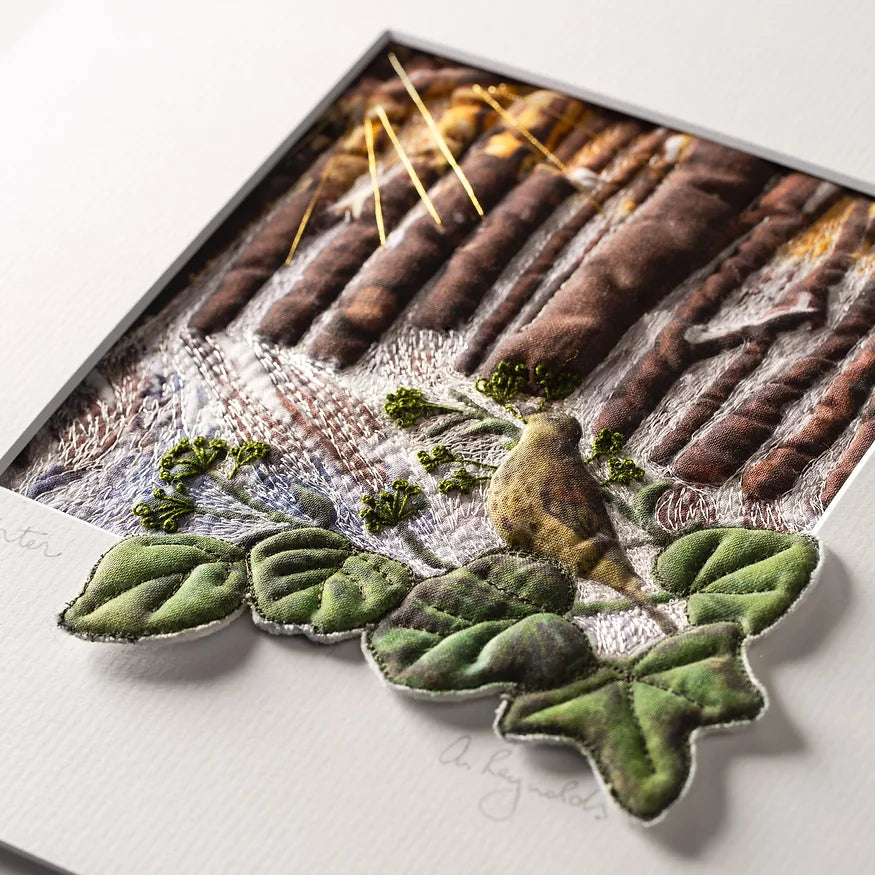 Here I have created the four seasons in textiles and given each their Irish name. Each art piece is based on my photo taken in Mullaghmeen Woods near Oldcastle in Co. Meath. They show the changing colours of the season and creatures associated with it in fabric, dyes and stitch..