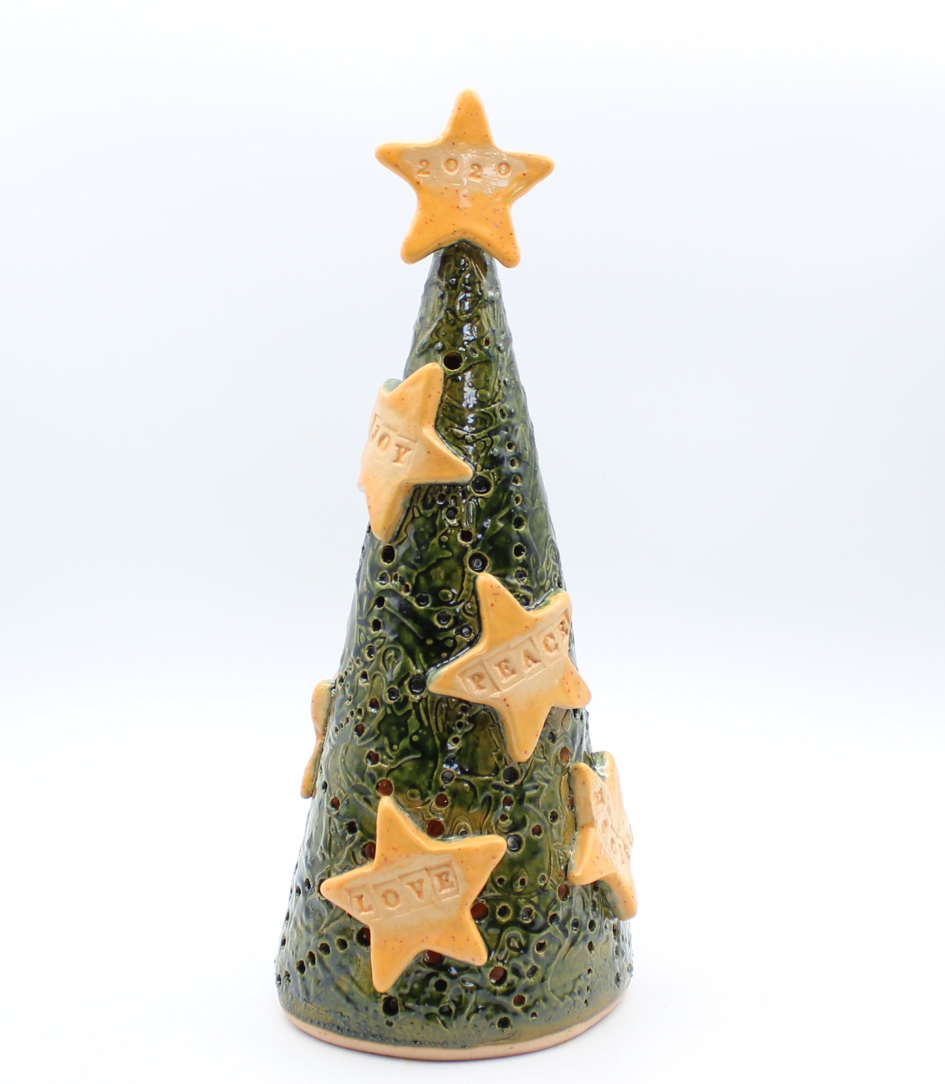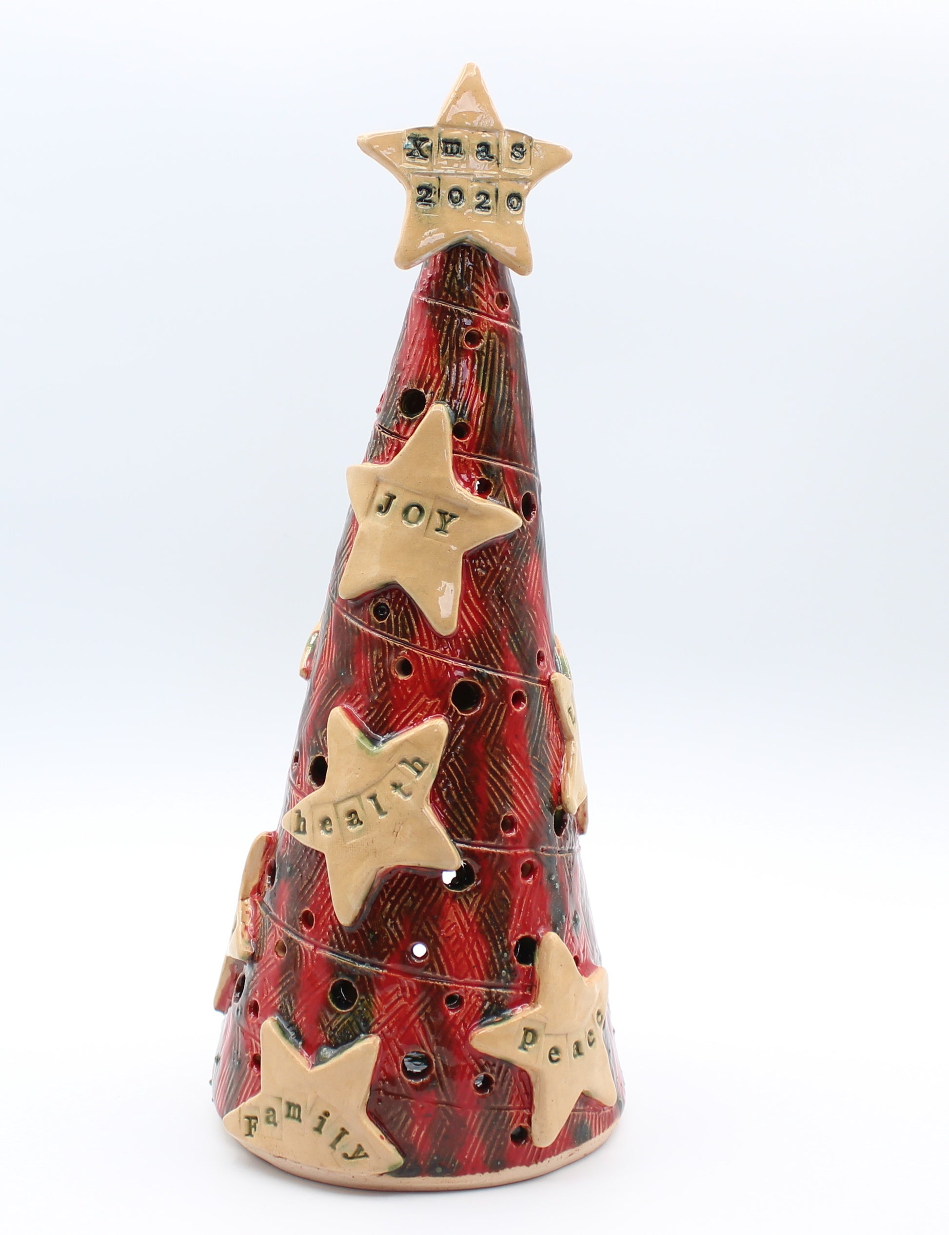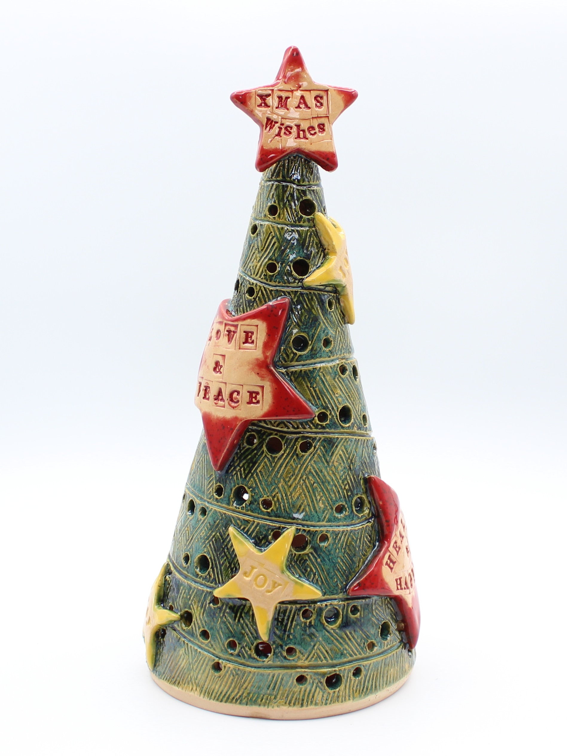The lantern is handmade from slabs of clay and decorated with star shaped Christmas wishes. You can light a candle inside the piece and enjoy the suffused light it emits. This design can be ordered in green or red.